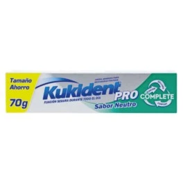 Kukident Pro Complete Sabor Neutro es una crema adhesiva para prótesis que ofrece fijación firme (10 veces más firme que sin usar ninguna crema) y confort durante todo el día, independientemente de la comida o bebida.